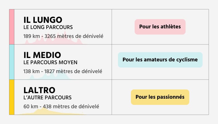 Dans cette aventure, chaque kilomètre compte, c’est pourquoi la compétition prévoit 3 parcours, tous au départ du Port Canal de Cesenatico, conçus pour s’adapter à tout type de cycliste :